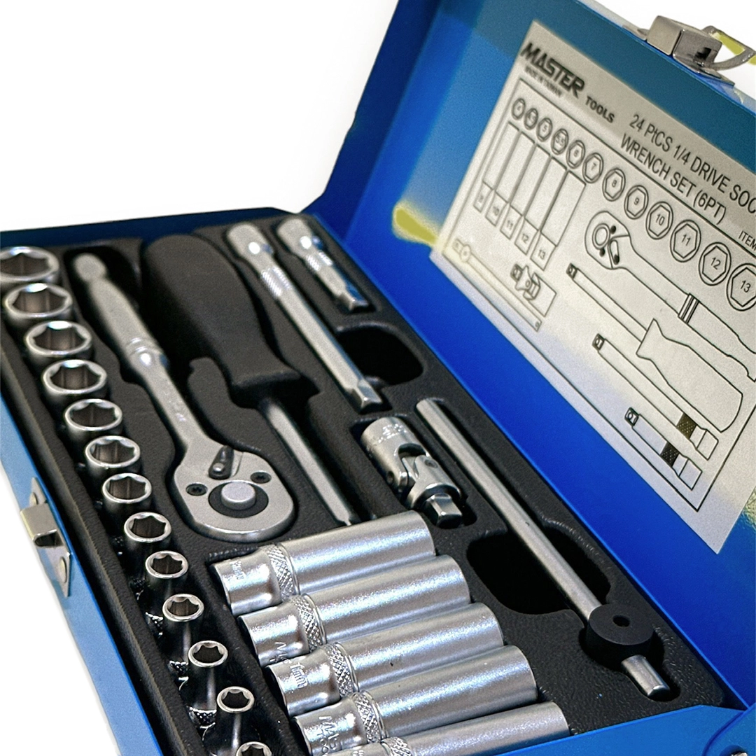 جعبه بکس 24 پارچه هواگیری مسترتولز با درایو 1/4 یک سری کامل برای انجام کار های شماست. این سری با کیفیت مناسب خود در مقابل شرایط مختلف و تحت فشار مقاوم است و از 12 ماه گارانتی بهره می‌برد تا خریدی مطمئن داشته باشید.